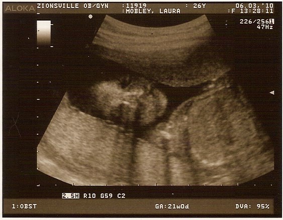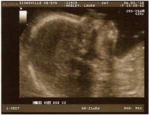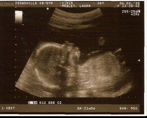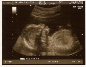 Yesterday I had my 20 week ultrasound and everything was great! Baby has a properly measuring brain and spine, 4 heart chambers, 2 kidneys, 1 bladder and a closed lip and nose. The baby was breech (butt down) and had a foot in the way so the technician couldn’t even tell the sex of the baby! I guess it was meant to be. Baby weighed 11 ounces and we got to see him/her move a little bit, mainly opening and closing its mouth. We got to look at the face for a while too, but it pretty much just looks like a skeleton right now. We are thrilled to have a healthy baby and can’t wait to find out if it’s a boy or girl in another 20 weeks!