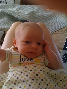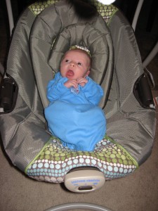 Ethan has continued to be a little gentleman over the past week. His favorite activities include eating and being held. If he could eat and be held all the time he would always be happy! We’ve had a tough time this week getting him to sleep at night. He tends to only go 2 hours between feedings at night and then does not want to be put down, which results in very little sleep for me. Jason has been giving him his last bottle of the night so I can go to bed early and get a good chunk of sleep. Last night we tried swaddling him for the first time and it worked great! He slept for 3.5 hours then another 3 hours. I think I ended up getting around 8 hours of sleep (broken, but I’ll take it). He also took a very long nap this morning so I was able to get a few things done around the house. Hopefully he has gained enough weight that we can let him have these long stretches of sleep without having to feed him. Last Thursday he was 6lbs 15oz. I have been going to a breastfeeding support group at the hospital so I will get to weigh him again this week. It was our first trip out of the house (just the two of us) last week, and it was nice to be able to talk to other new moms.