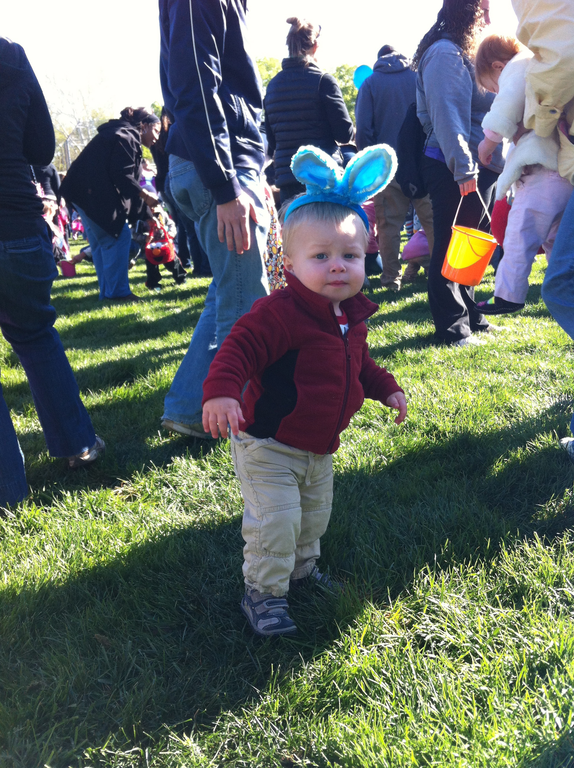 We started at the Zionsville Easter Egg Hunt on Saturday morning. We got there just as the 1-2 year old hunt started and it sure was crazy! We now know to get there early next year. Ethan got a total of 2 eggs and was thrilled. He loved opening and closing the eggs and would have been happy if they were empty.