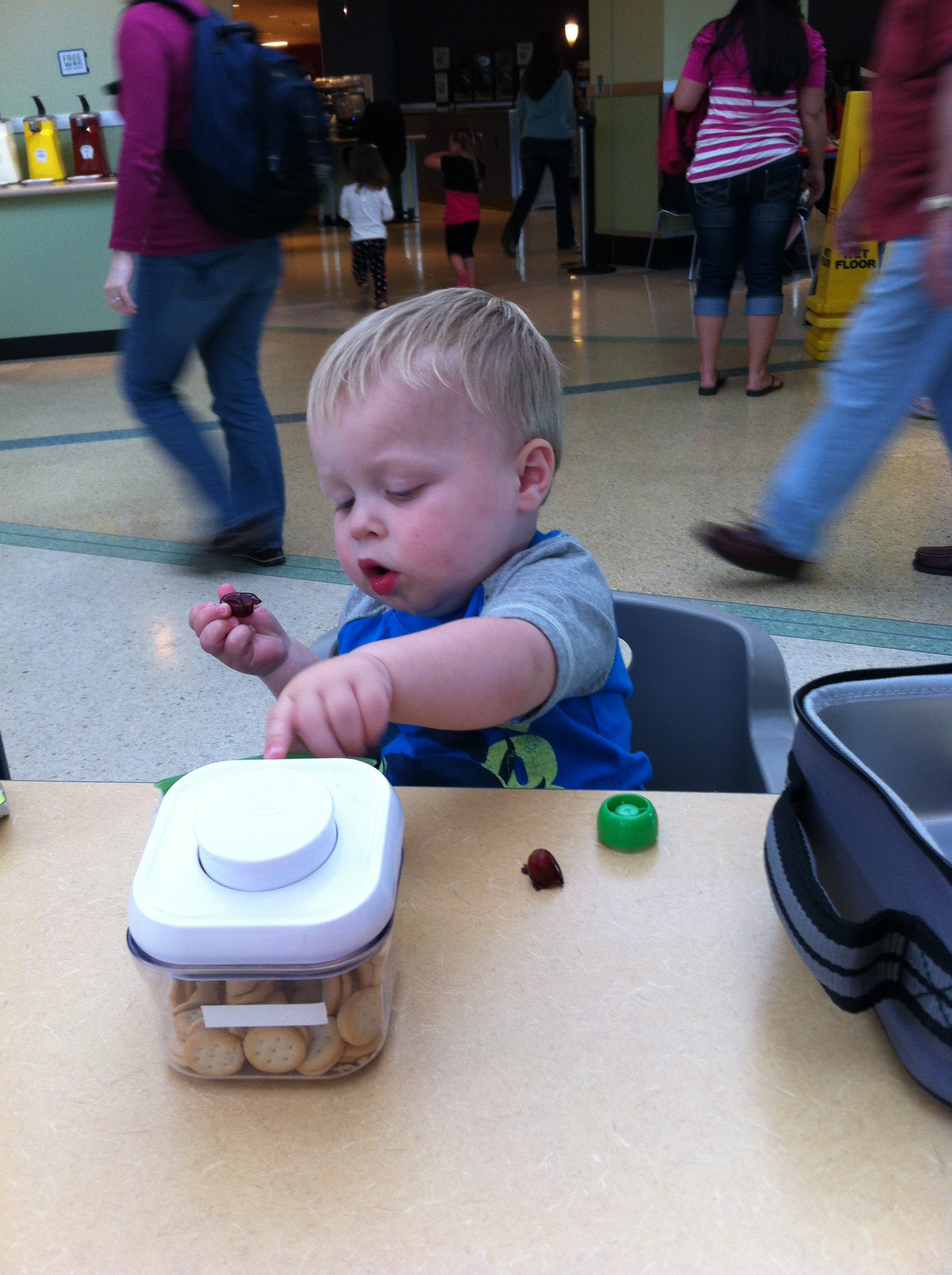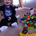 Two of Ethan’s favorite toys right now are “Elmo Street” (his Sesame Street play house) and Legos. He loves playing pretend and narrating his characters. Common story lines are characters going to the bathroom, going to take a nap, going to the store, or making something to eat. He named one of his Lego characters Noelle and refers to her as “Noelle Wego.” We love seeing his imagination and the things he comes up with. He also loves to play in his play kitchen and “make” us food.