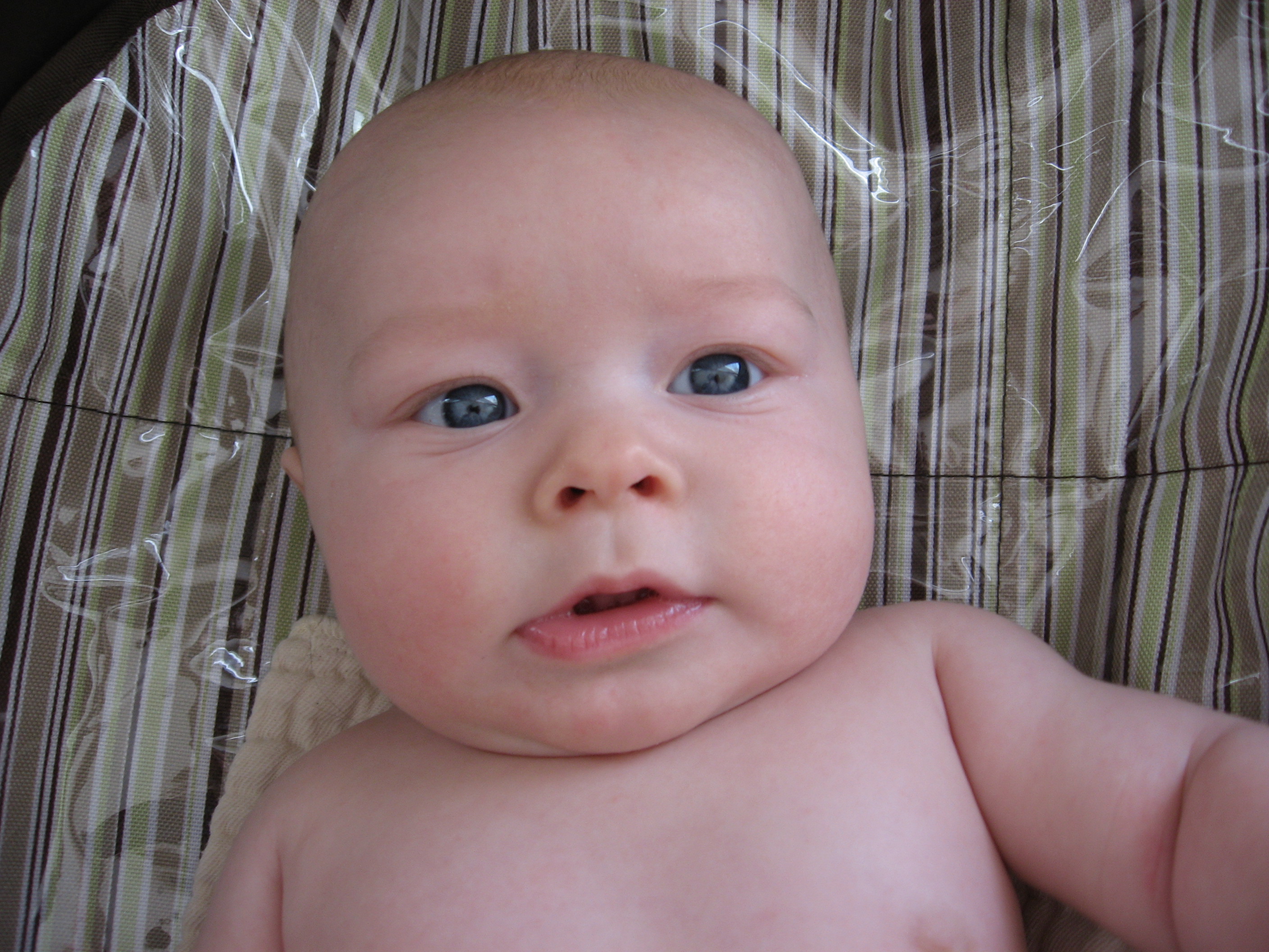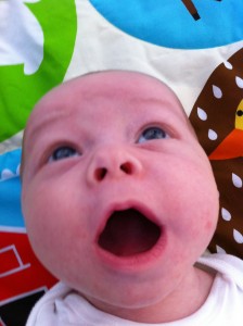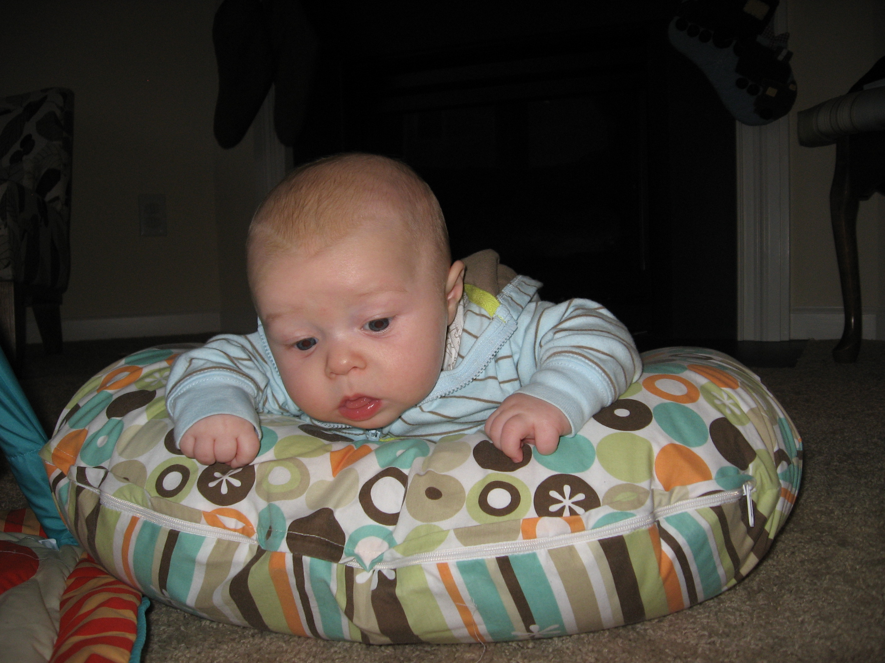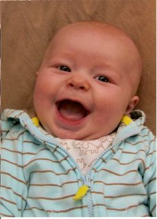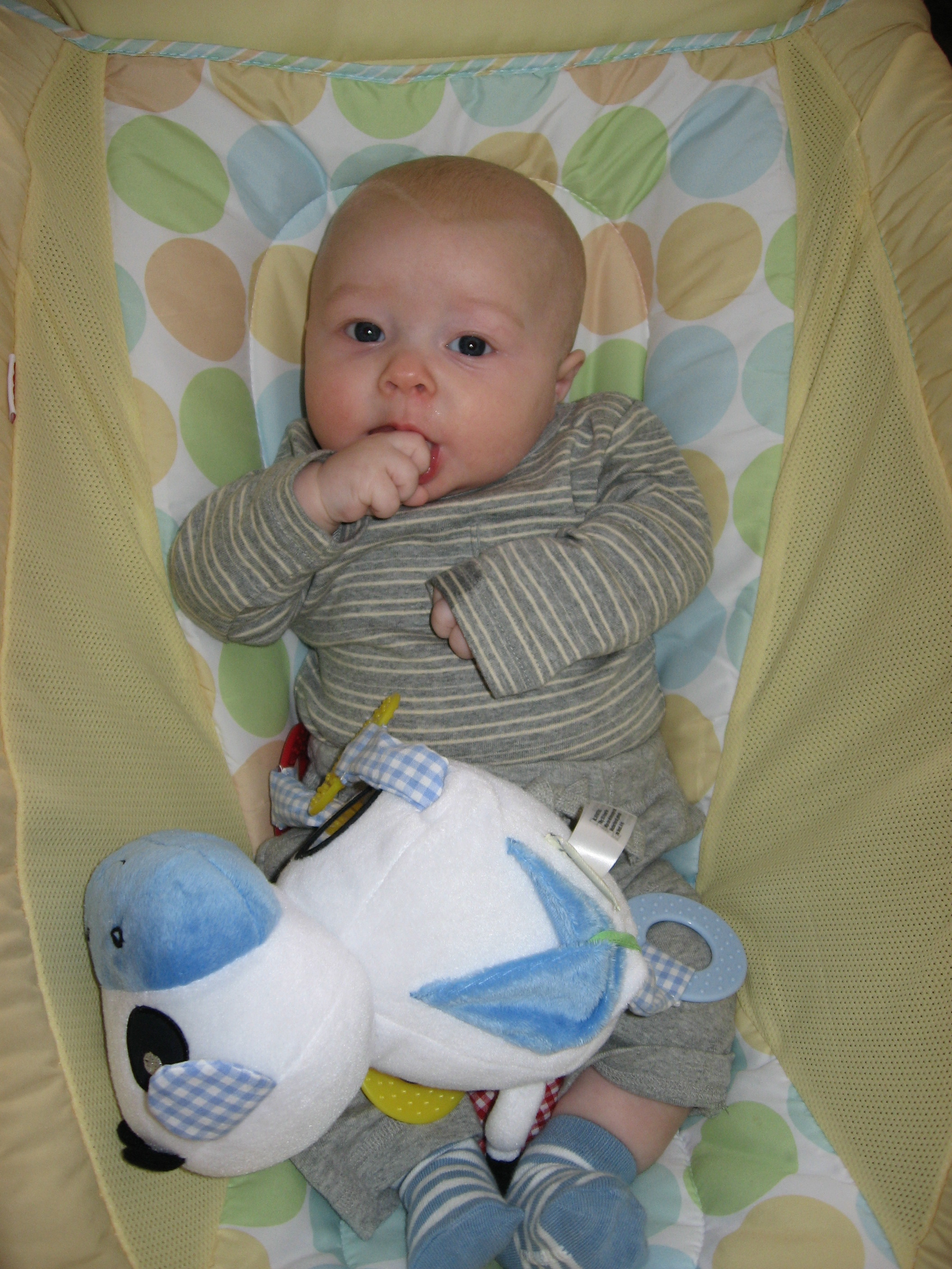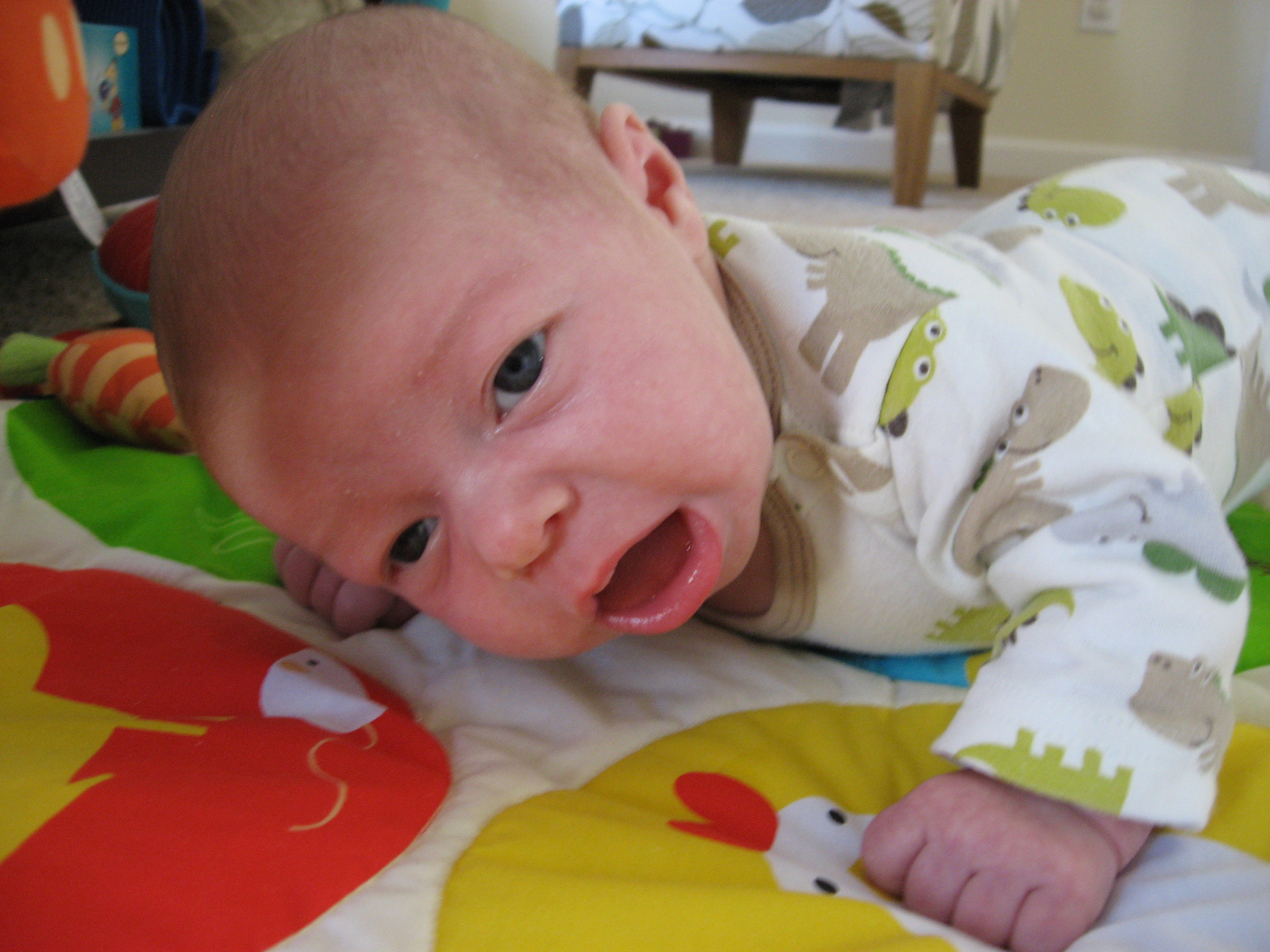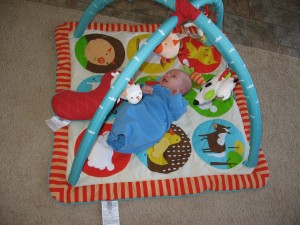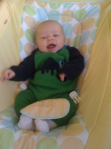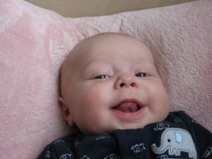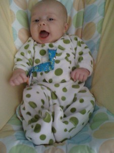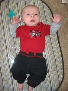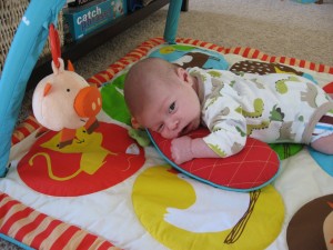 Ethan has started to do so many fun things in the past few weeks. Instead of chewing on his blanket when we put him on his belly, he pushes his head up and has even rolled over a few times. He is getting much better at sitting up in his bumbo chair, though I think it will still be a while before he will sit up on his own. He still loves sucking on his hands, but has also mastered pulling his toys in his mouth and sucking on them as well. He is making lots of fun noises and babbles and smiles all the time. His new favorites noise is looking at us and making a “keeeeee” sound with his tongue, usually spraying us with slobber. He is usually smiling when he does this, and it is pretty cute. He has started to giggle too. We have some cute videos we will try to post soon.