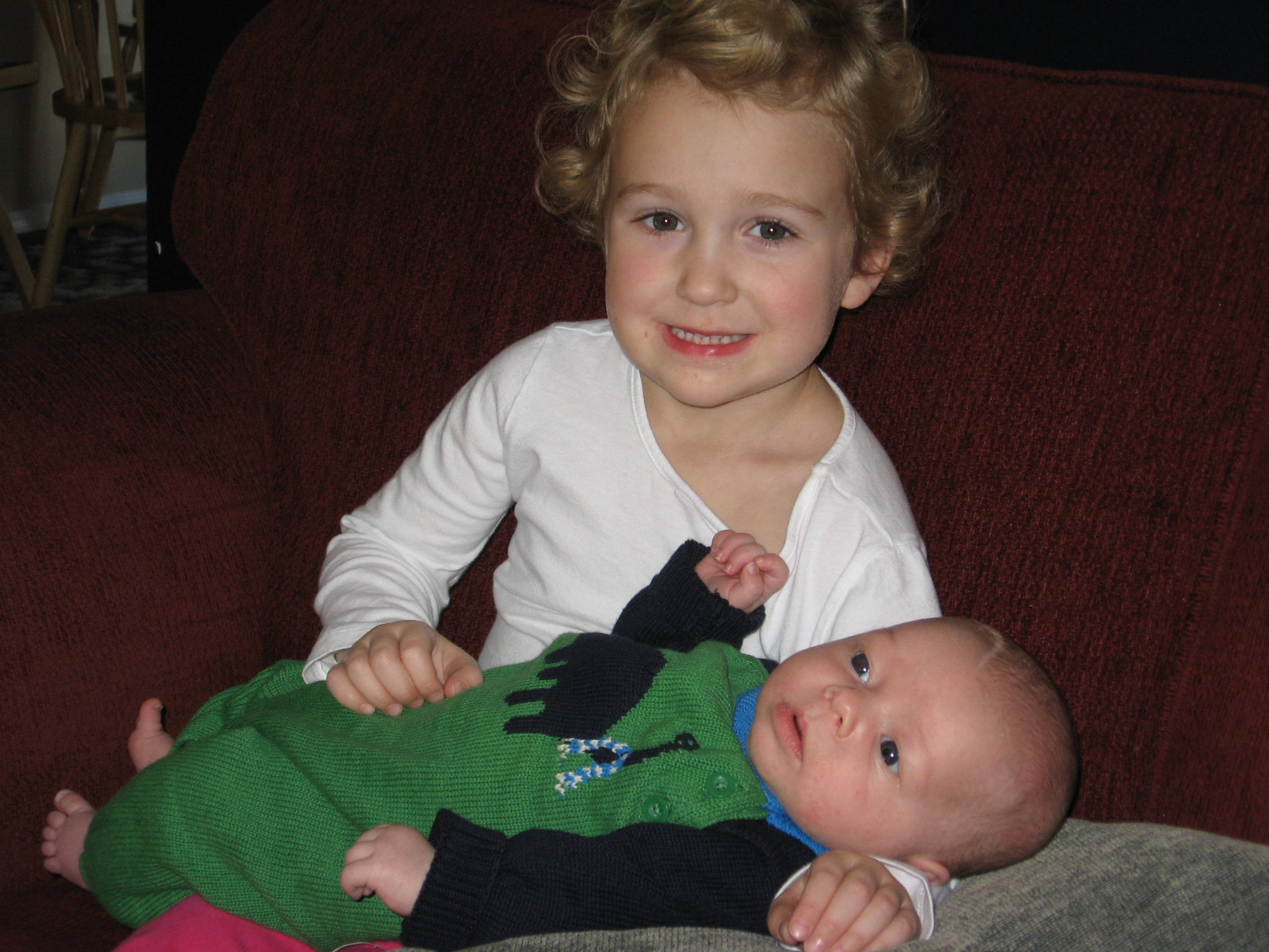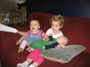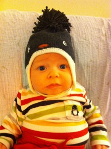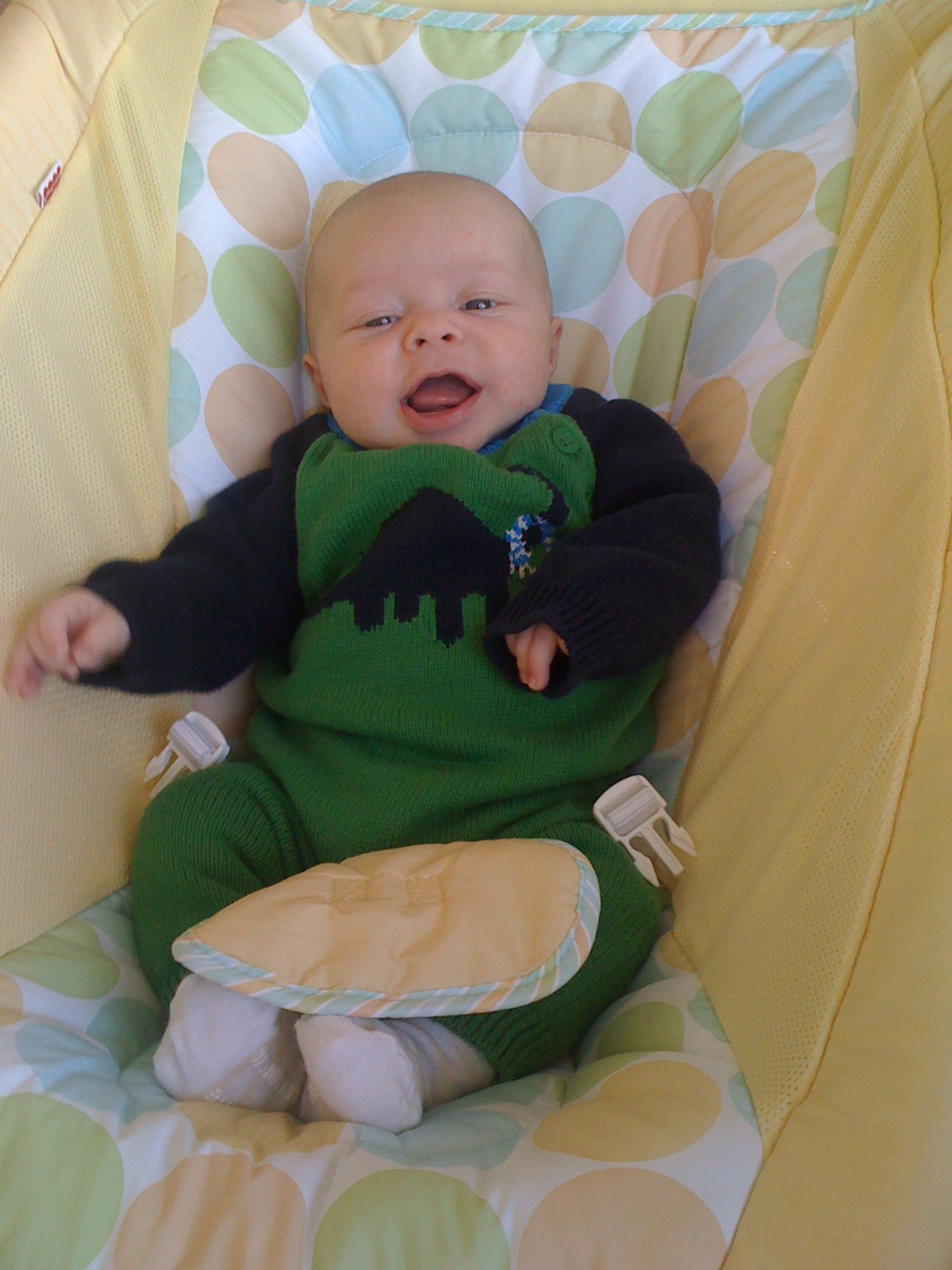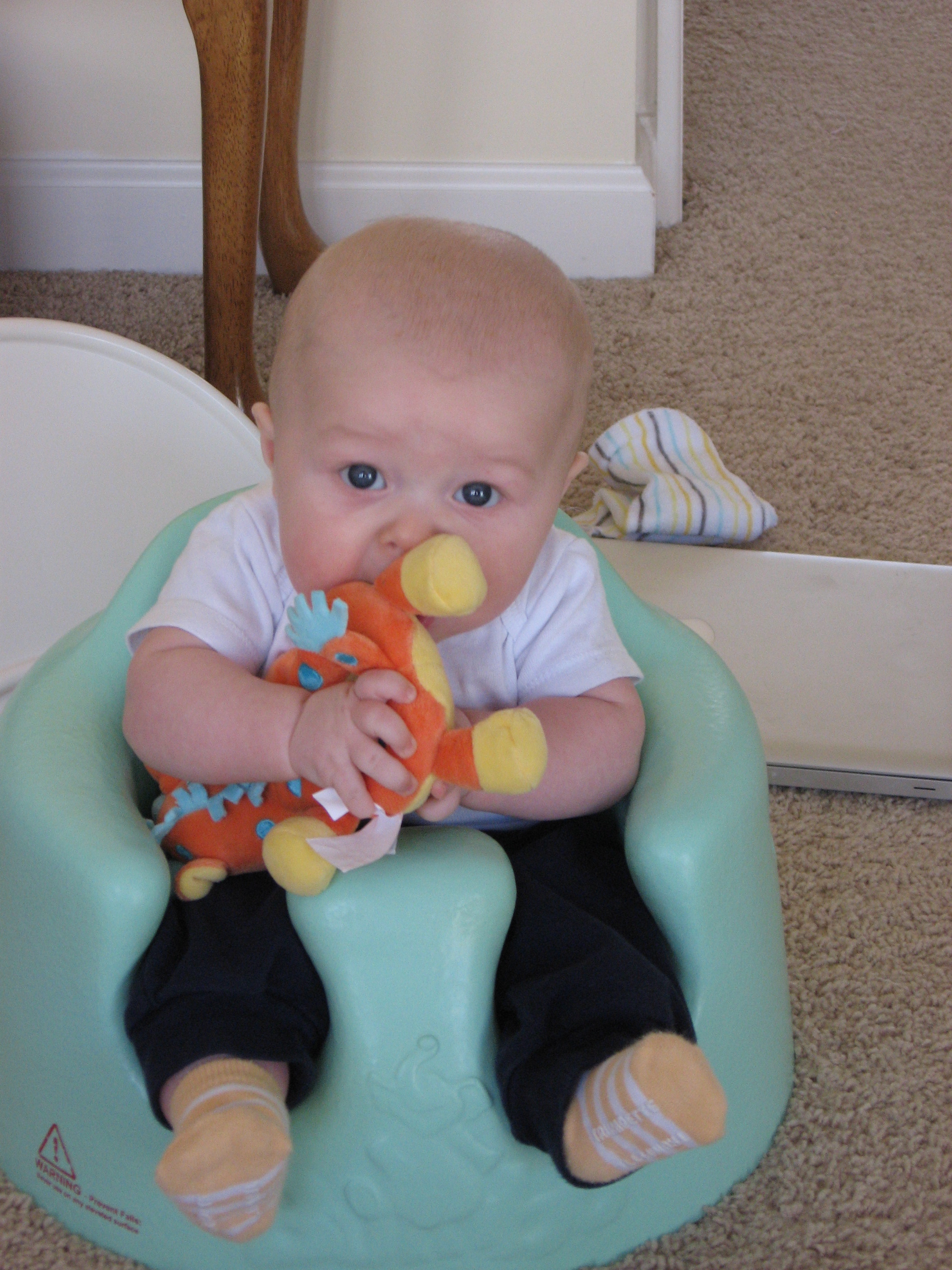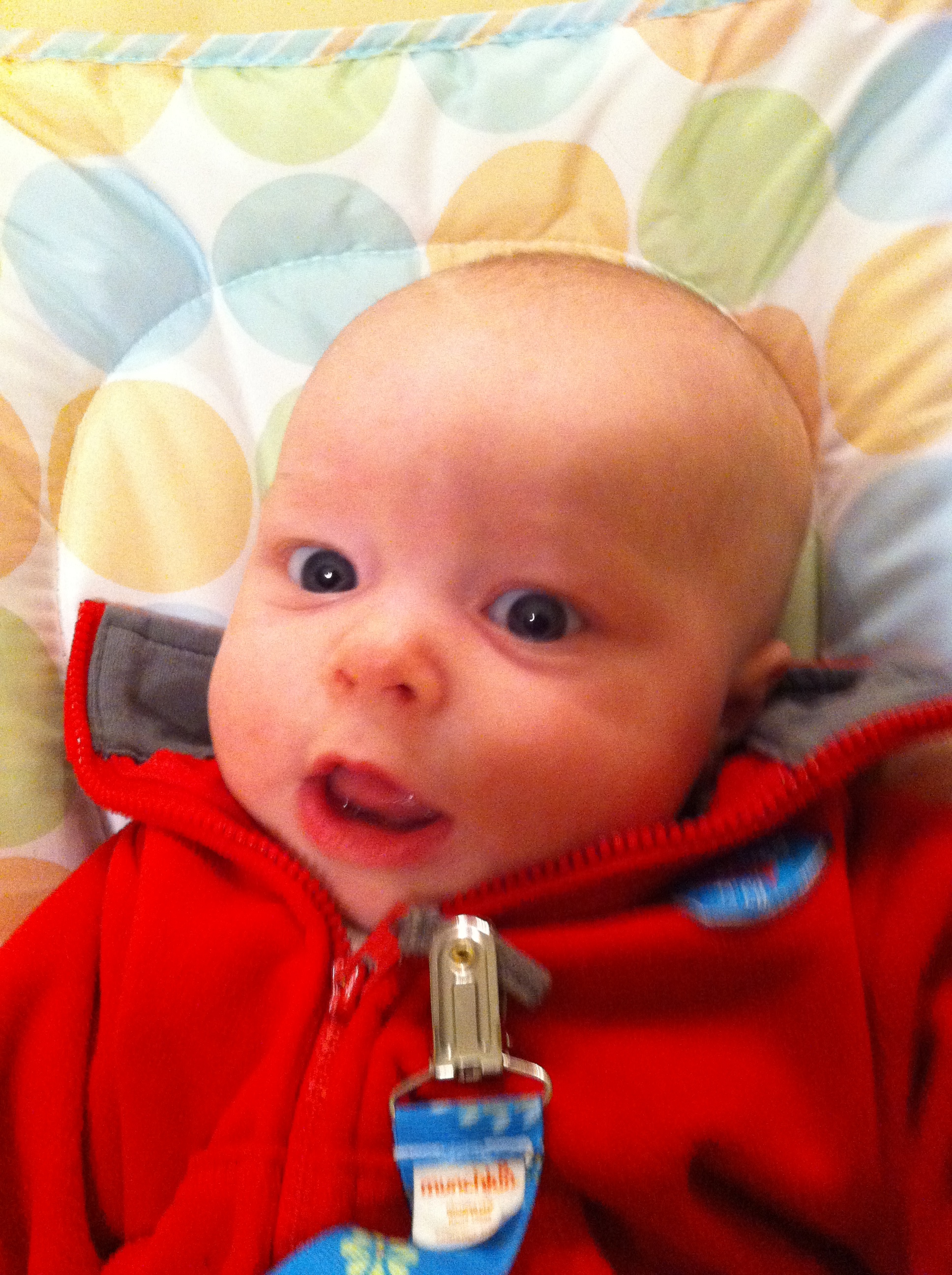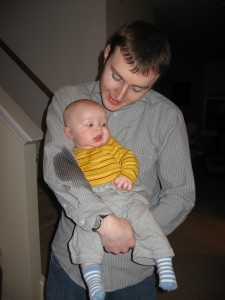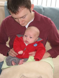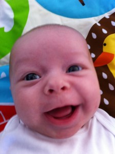 Ethan has started to do so many fun things in the past few weeks. Instead of chewing on his blanket when we put him on his belly, he pushes his head up and has even rolled over a few times. He is getting much better at sitting up in his bumbo chair, though I think it will still be a while before he will sit up on his own. He still loves sucking on his hands, but has also mastered pulling his toys in his mouth and sucking on them as well. He is making lots of fun noises and babbles and smiles all the time. His new favorites noise is looking at us and making a “keeeeee” sound with his tongue, usually spraying us with slobber. He is usually smiling when he does this, and it is pretty cute. He has started to giggle too. We have some cute videos we will try to post soon.