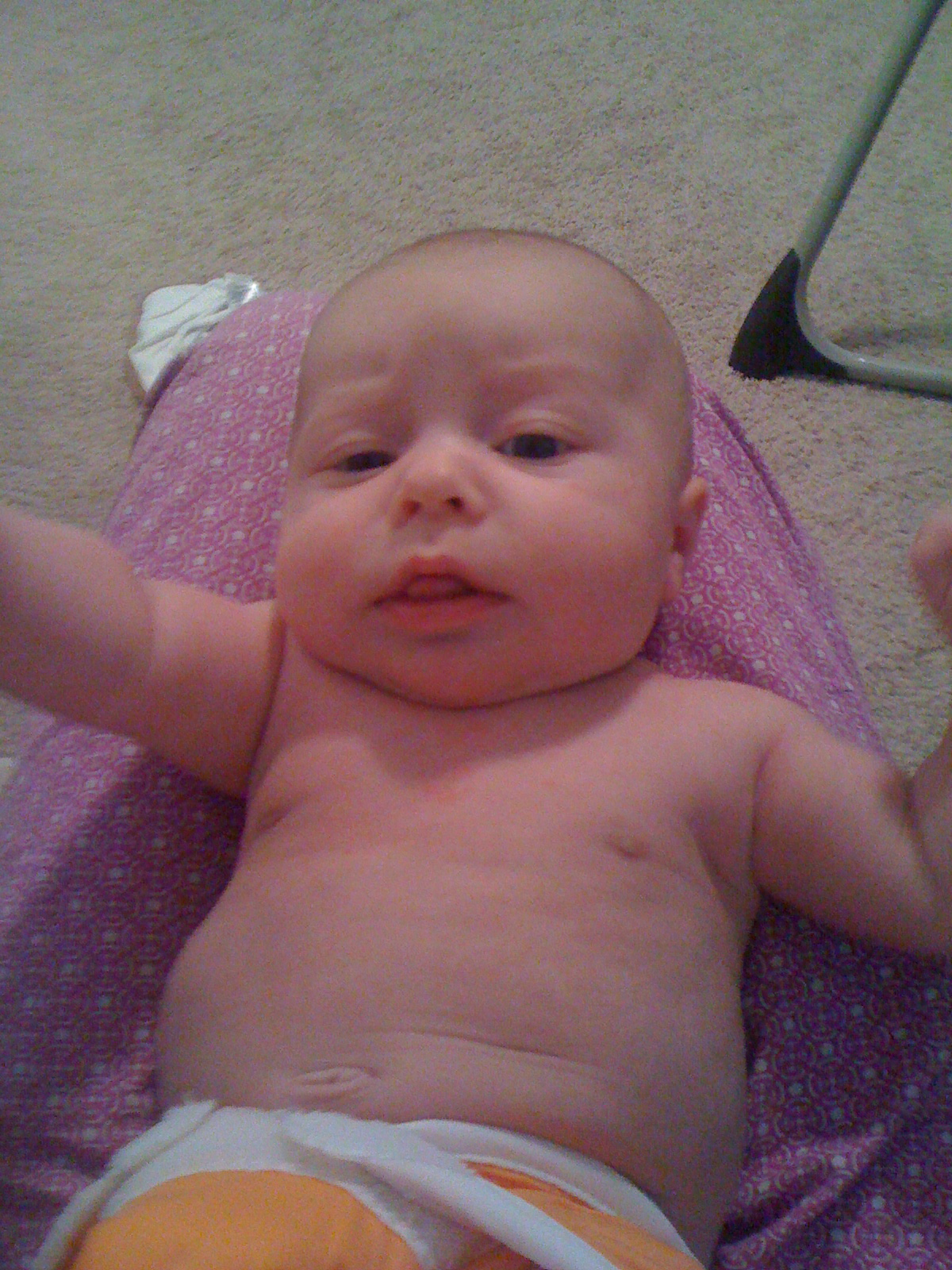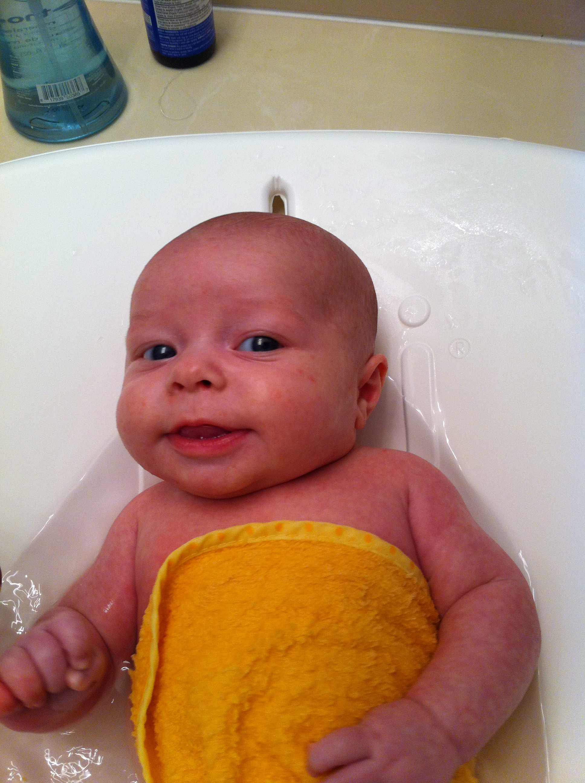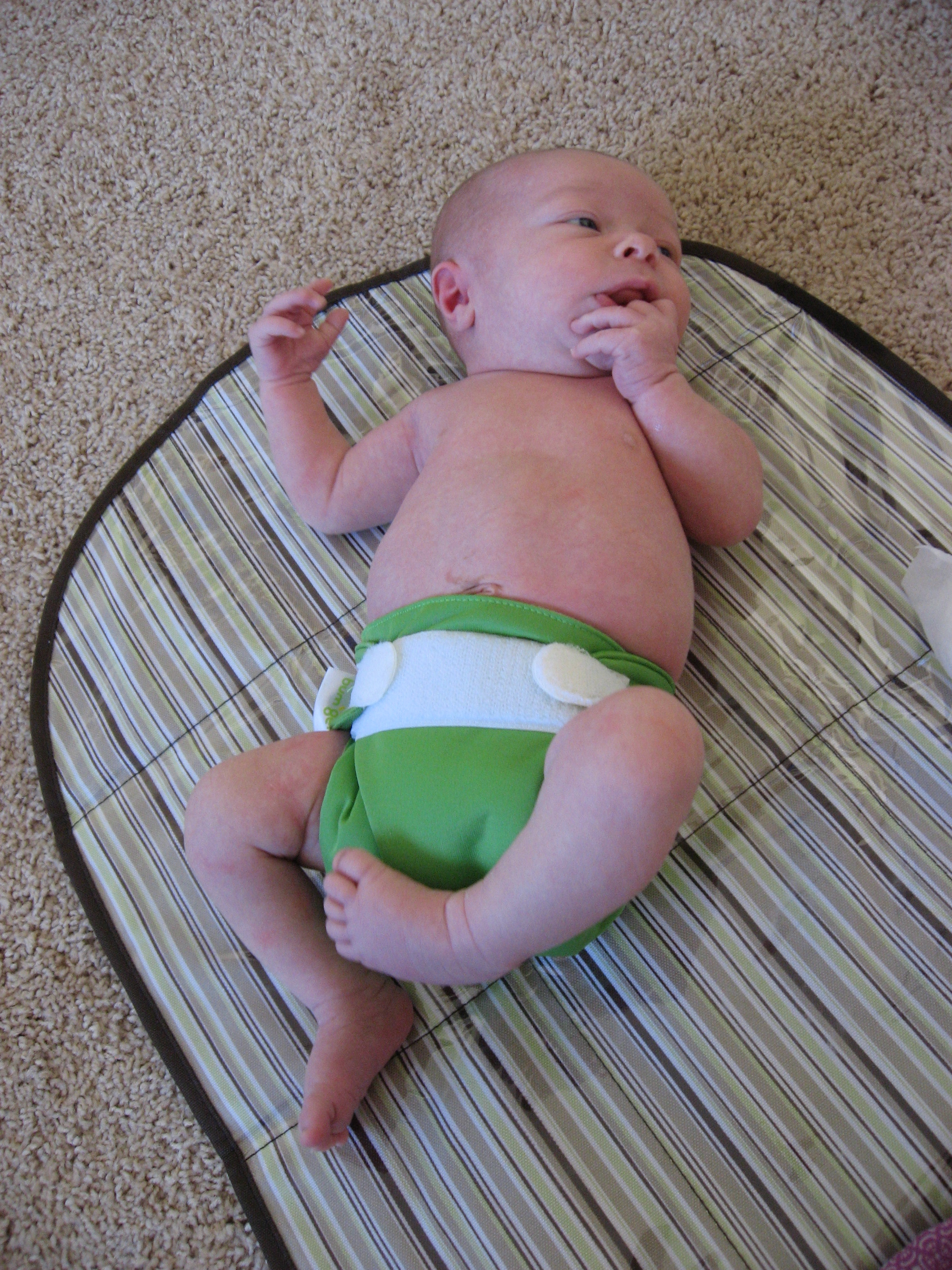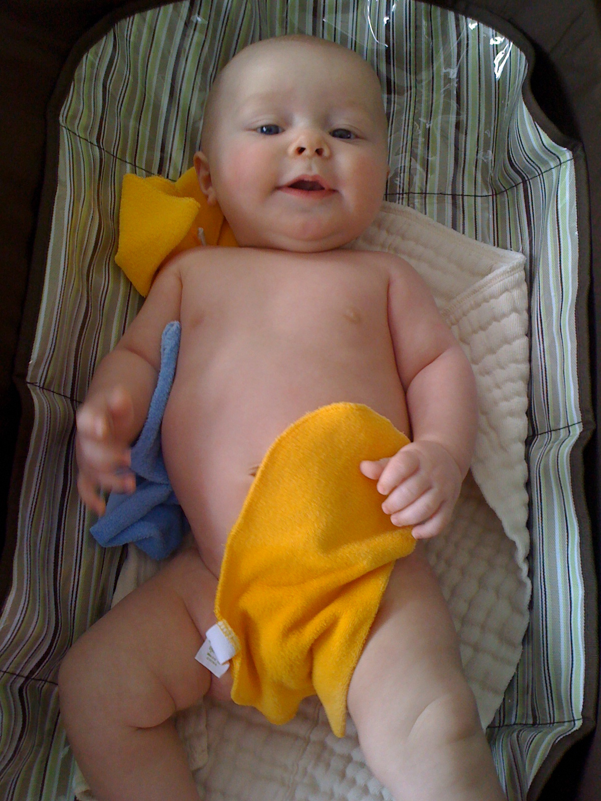 This is Ethan’s favorite new game. We have to keep him covered so he doesn’t pee on us during a diaper change. He immediately grabs the washcloth and waves it in the air or chews on it, then drops it and grabs the next one we cover him up with!