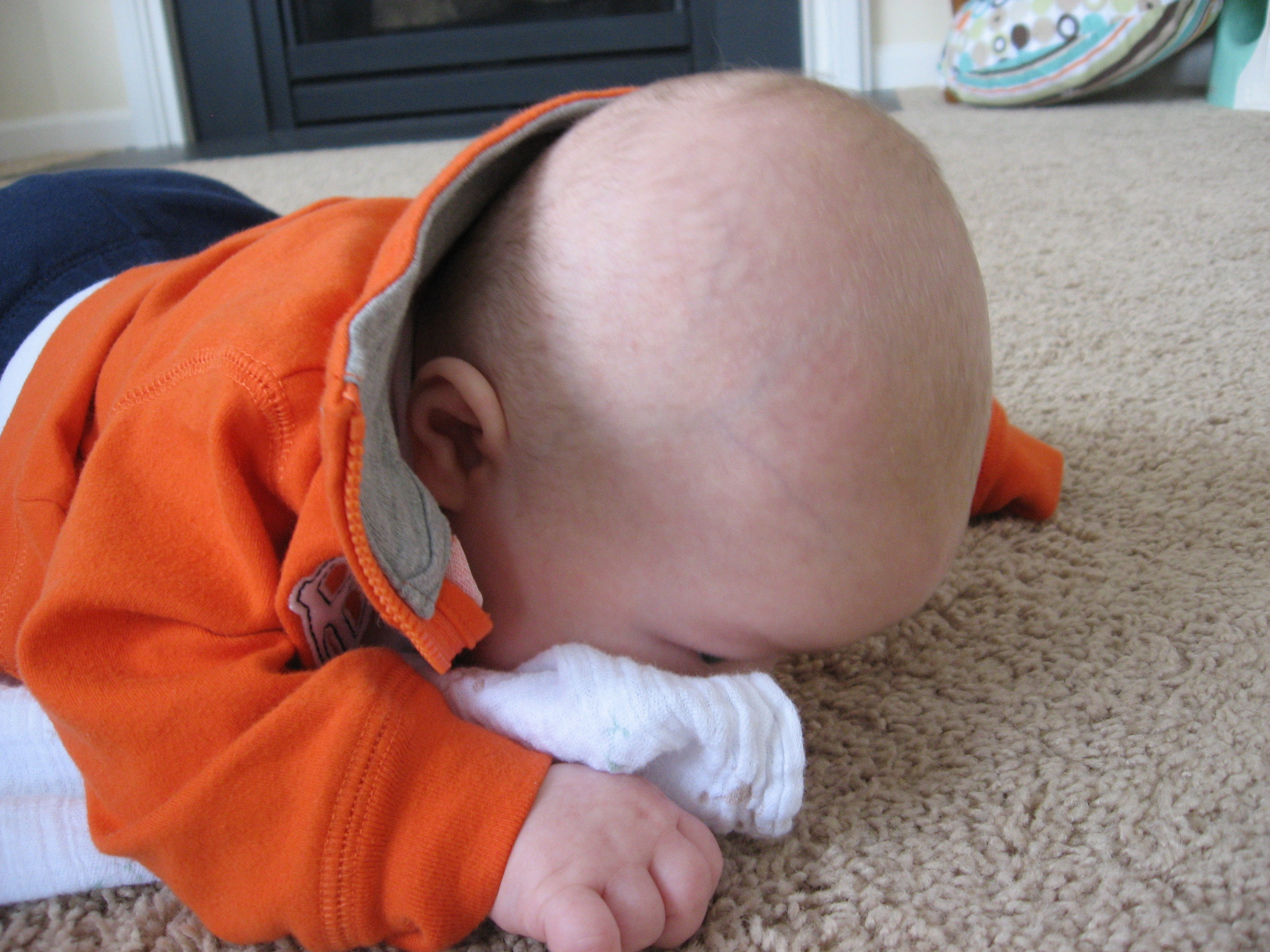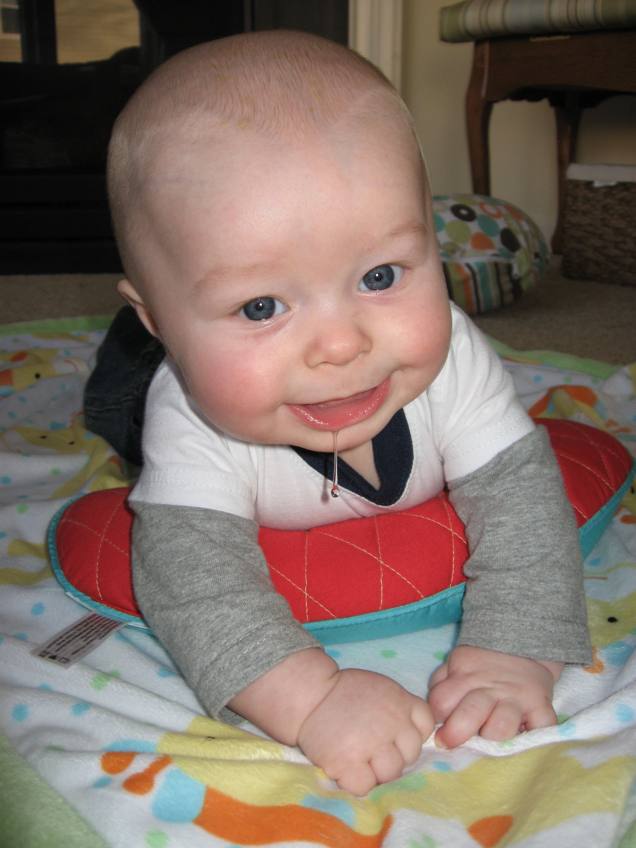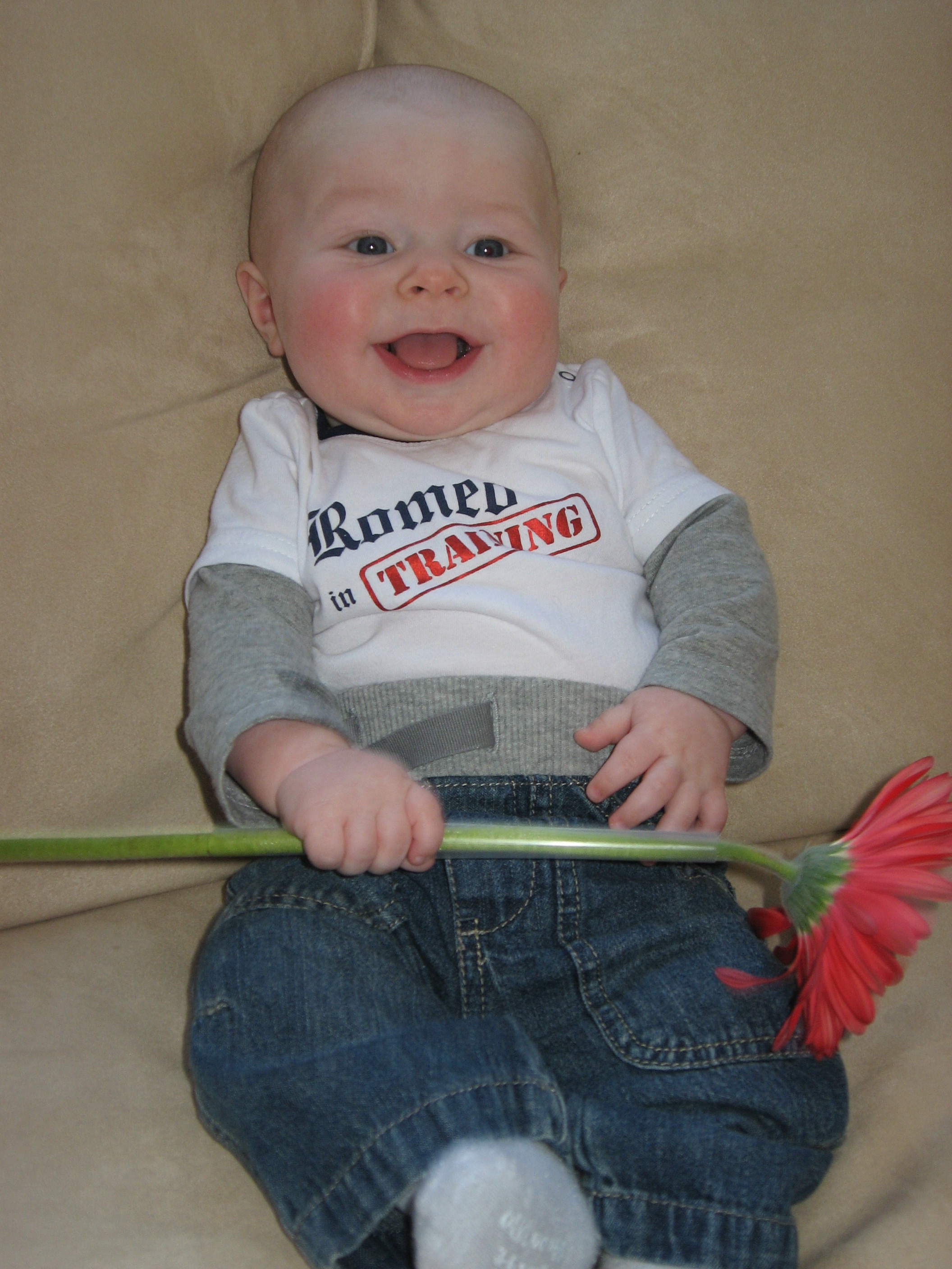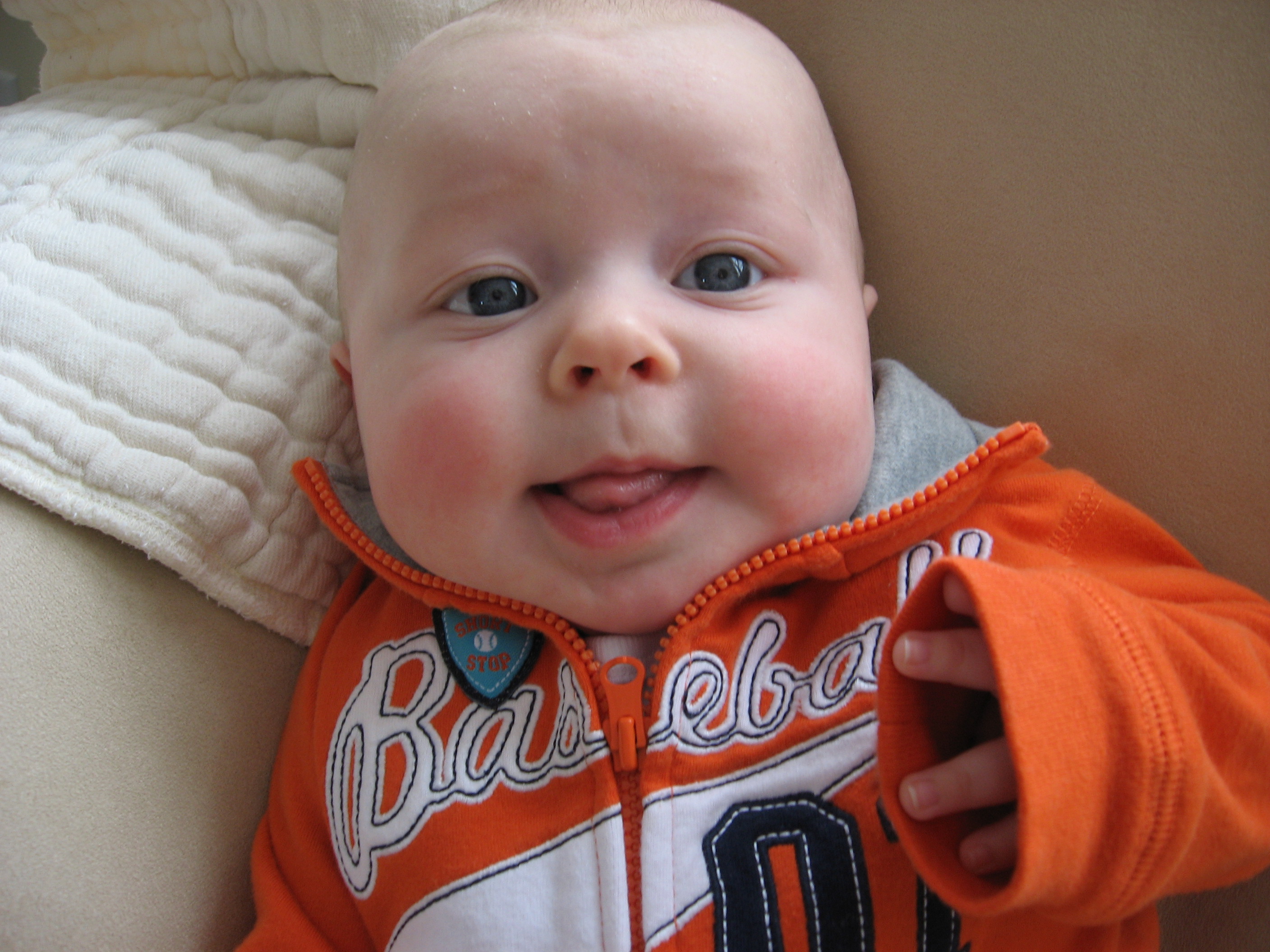 Our sweet boy is still growing like crazy! His 4 month appointment on Friday confirmed that he is still perfect! He weighed 14lbs 8oz (43%), was 24.25 inches (27%), and his head circumference was 42cm (44%). He handled his shots like a champ again (Jason says he is a tough guy). We spent the rest of the day snuggling on the couch, but he really didn’t seem to have any discomfort after.